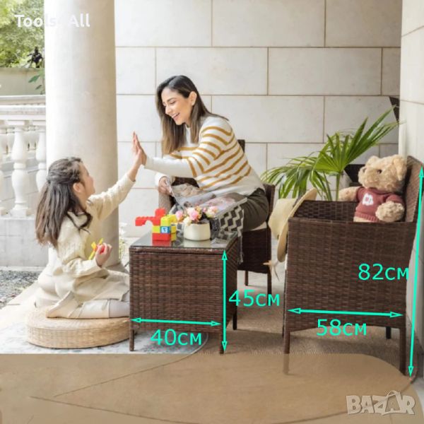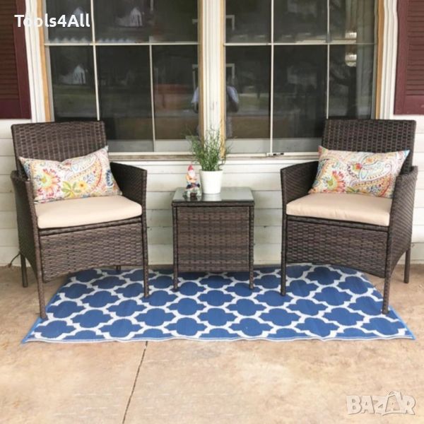 Благодарение на водоустойчивият и слънцезащитен ратан, градинският комплект е издръжлив, лесен за поддръжка и подходящ за ежедневна употреба дори на открито.