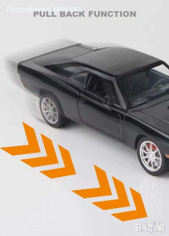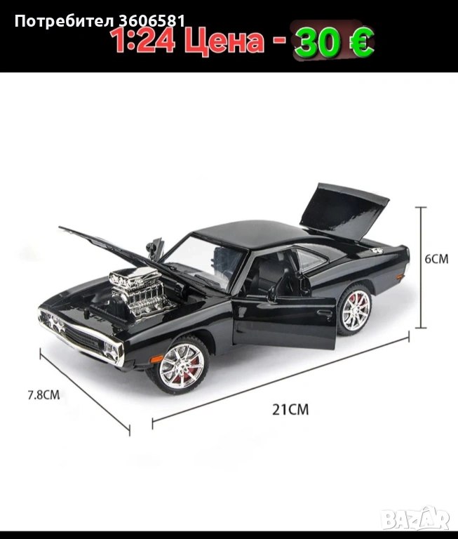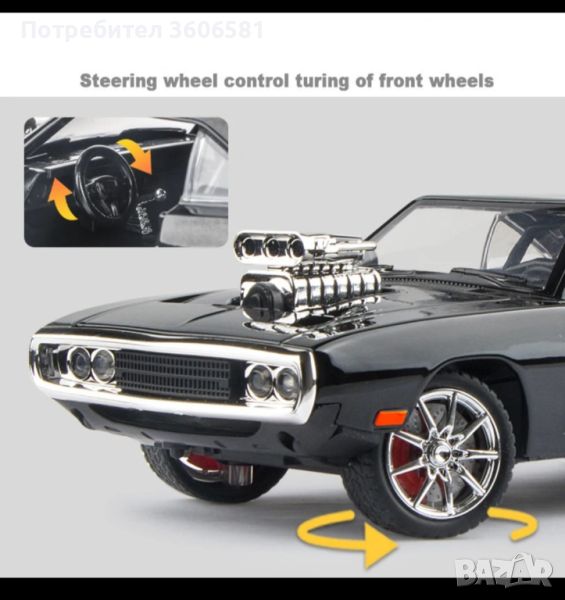 Метален модел играчка детаилен и реалистичен на спортната кола Dodge Charger 1970 г. в съотношение 1:24 спрямо релния размер на колата от известния филм Бързи и Яростни + батерий към колата.
