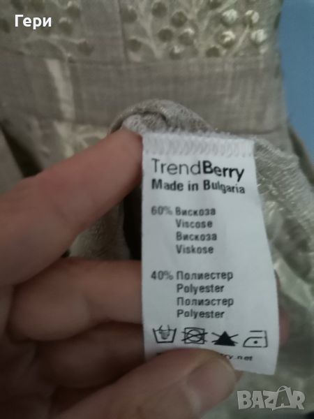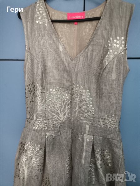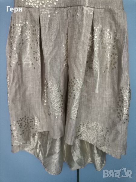 Размер Л по етикет. Много елегантна. Подмишници - 44 см, талия - 40 см, дължина в предната част - 100 см, гръб - 122 см. Няма еластичност. Без подплата, но не прозира.