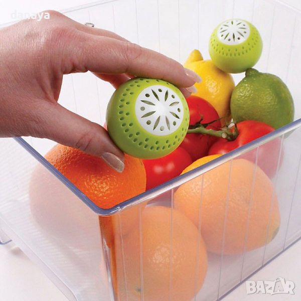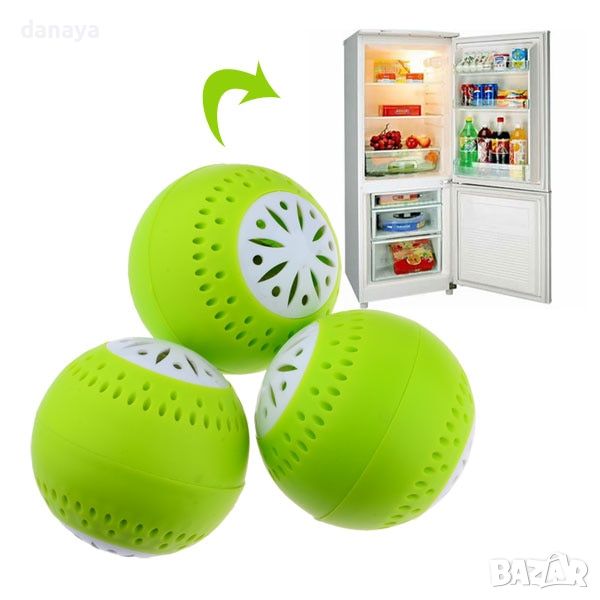 Комплект от 3 броя топки за абсорбиране на миризми от хладилник. С тях можете да удължите живота на свежите продукти (като плодове и зеленчуци) до три пъти повече, благодарение на активния въглен в тях. Просто поставете тези еко топки в хладилника и те ще абсорбират газовете, които се освобождават от храните, а така те ще се развалят много по-бавно от обикновено. Премахват и неприятни миризми в хладилника.