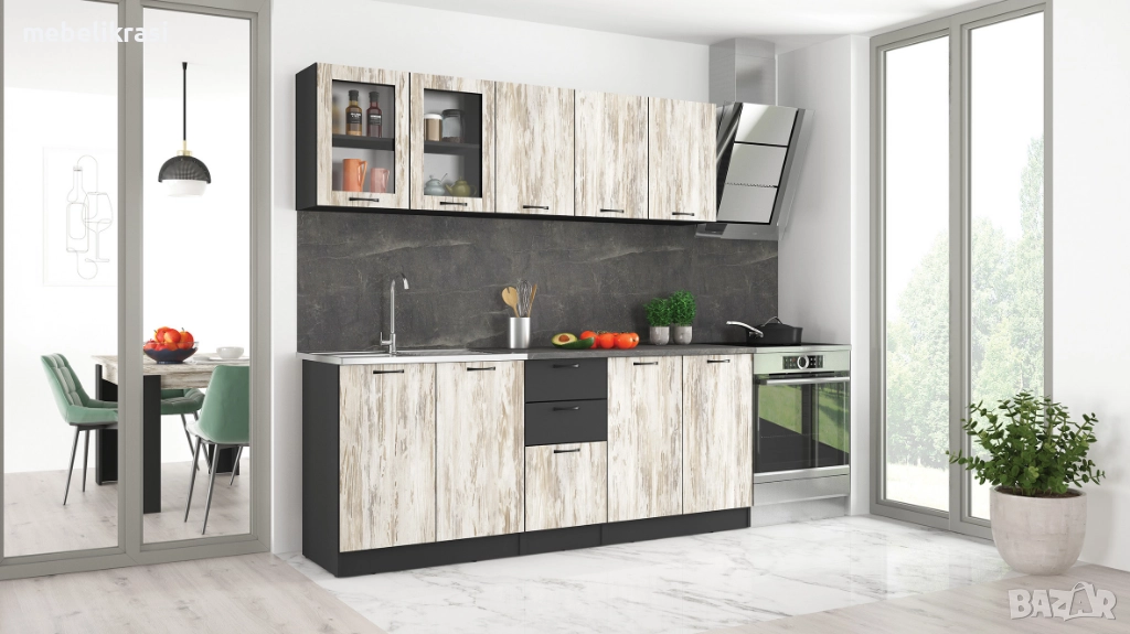 Съставен от горни и долни кухненски шкафове, включително шкаф с витрини, шкаф с чекмеджета и шкаф за бордова мивка.