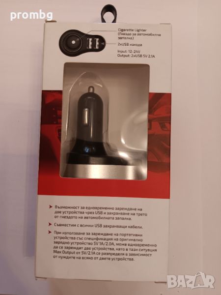 зарядно за автомобил с 2xUSB, 12-24V, 1x гнездо за запалка. Дава възможност за едновременно зареждане на две устройства чрез USB и захранване на трето от гнездото на автомобилната запалка. Съвместима е с всички USB захранващи кабели. Технически данни: 5V, 2,1A
