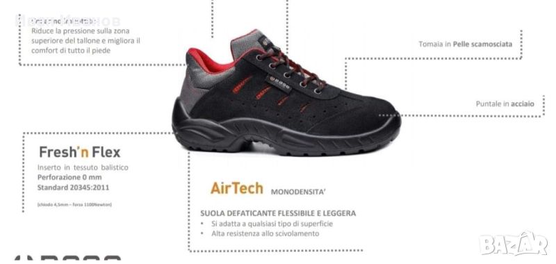 Нови , само пробвани . *Smell Stop: Подплата с трайна антибактериална обработка. Намалява миризмите и риска от инфекции, причинени от потта.*Език с маншон за защита на краката от прах.*Горна част от плюшена цепена кожа.* Стоманен пръст.*Air Tech: Подметка против умора, гъвкава и лека: Адаптира се към всякакъв тип повърхност. Висока устойчивост на приплъзване.*Подплатена яка за осигуряване на максимален комфорт и предотвратяване на възпаление на сухожилията.*Fresh'n Flex: Вложка от балистичен плат: 0 mm перфорация. Нов стандарт 20345:2011.УПОТРЕБА НА ПРОДУКТА: Идеалното съотношение качество-цена, за умна обувка, която отговаря на всяка нуждаДИЗАЙН И ФУНКЦИОНАЛНОСТ: Base Protection произвежда предпазни обувки, съчетаващи технология и функционални изисквания, за да отговори на професионални и по-взискателни клиентиМАТЕРИАЛИ: Suedeleather, SmellStop, Antiodor and Antibacterial, Fresh'n Flex SteelХАРАКТЕРИСТИКИ: Антистатични обувки, водоустойчива горна част за предотвратяване на проникване на вода, 200 джаула устойчива капачка на пръстите