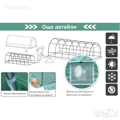 Предлагаме оранжерии с различни размери, изработени от висококачествен 180-грамов найлон на квадратен метър, който осигурява по-добра устойчивост на метеорологичните условия и по-дълъг живот.