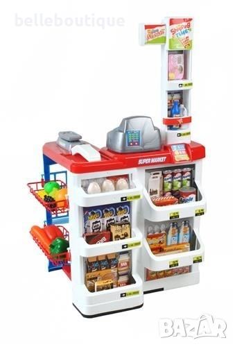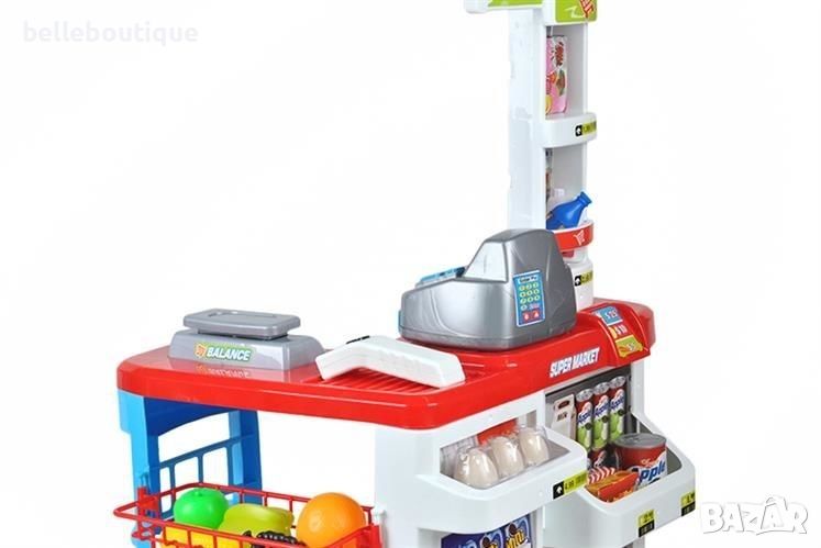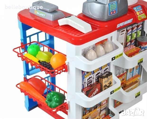 Детски супермаркет с аксесоари – играчки за деца. Има касов апарат с везна и брояч, изкуствени пари и продукти, поставени на много рафтове, както и количка за пазаруване, което позволява незабавно и интересно забавление. Комплектът се захранва от батерии; скенерът свети с червена светлина, имитираща лазерен лъч, а също така издава характерен звук, потвърждаващ, че кодът на продукта е прочетен, което добавя реализъм и прави играта по-забавна. Цялото оборудване и продукти на супермаркета са многоцветни и по атрактивен начин имитират реалния интериор на магазина; стоките могат да се поставят на рафтовете на магазините и да се поставят в количката, включена в комплекта. Отделни групи продукти се поставят на рафтове и стелажи; комплектът включва и отворен хладилник; целият комплект успешно изгражда атмосферата и спецификата на голям магазин с разнообразно продуктово предложение, което дава на детето много възможности за игра самостоятелно или в група.