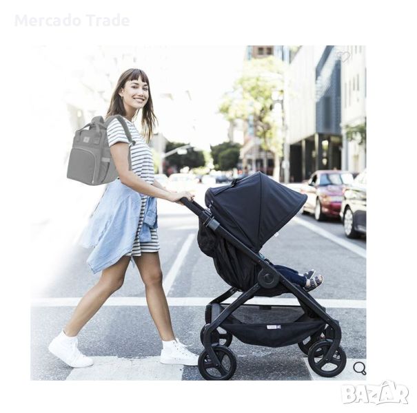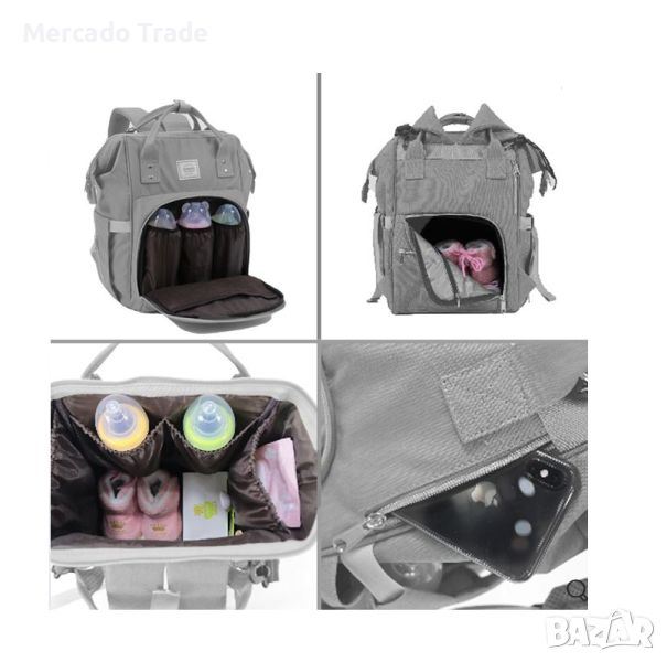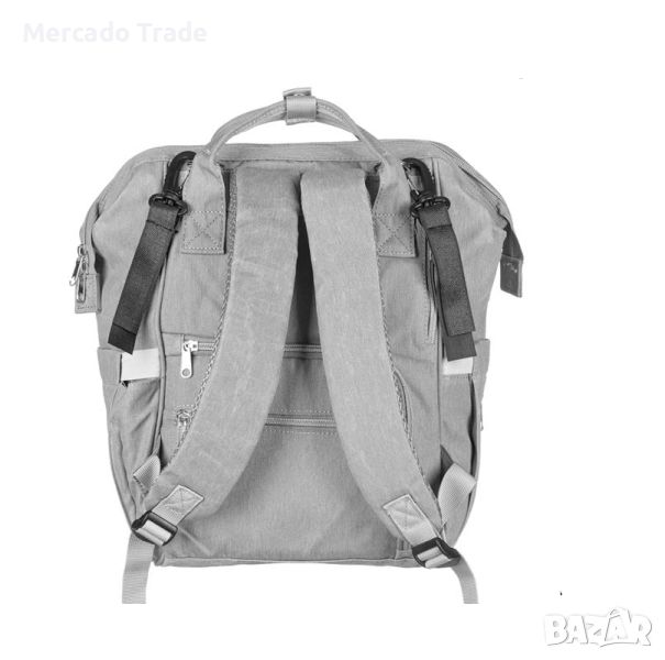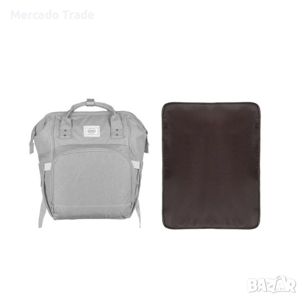 Бебешка раница Mercado Trade за повиване в матово сив цвят, с предпазен цип и вътрешна рамка отгоре, за да остане стабилна при отваряне. Осигурява лесен достъп до лични вещи и бебешки кърпички, има 2 вътрешни джоба с ципове и 4 джоба с ластик.