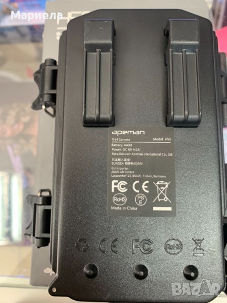 Камерата е закупена от разпродажба в Германия .Проектирана с най-иновативни идеи и технология от висок клас, камерата от серията APEMAN H е посветена на създаването на камери за диви животни.Камерата за диви животни H55 е по-здрава и водоустойчива , а корпуса на камерата е с нов дизайн.С 38 несветещи инфрачервени светодиода, камуфлажната камера H55 върши превъзходна работа при заснемане на кристално ясни нощни снимки и предлага широк диапазон на видимост (65 фута/20 м). Нощното виждане без светене няма да изплаши целта ви и ще предотврати кражбата на камерата .Камерата има светкавична скорост на задействане и кратко време за възстановяване , което гарантира , че няма да пропуснете нищо , което се движи бързо или бавно .Камуфлажната камера за диви животни има добра конструкция, дизайн и лесни за използване контроли. Прави впечатляващи 20MP снимки и записва страхотни 1080P видеоклипове ден и нощ.Капанът за камера H55 е с подобрен дизайн . Нейните LED светлини и лещи са сравнително независими от външния корпус, което гарантира силно водоустойчиво и прахоустойчиво представяне.2 цветни светлинни индикатора; времеви печат; зададена температура (по избор ℉/℃); PIR интервал и чувствителност; функция time-lapse; таймер; защита с парола и т.н.SD картата (клас 6 или по-бърза SD/SDHC, максимална поддръжка 32 GB), външно захранване и батерии (Energizer 1,5 V AA) НЕ са включени.Моля, форматирайте SD картата, преди да използвате камерата.