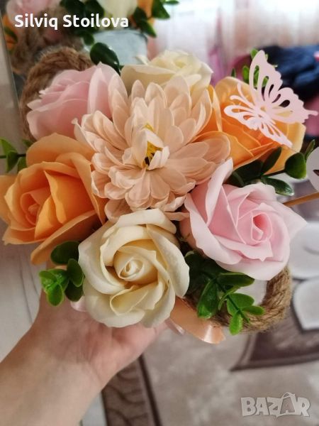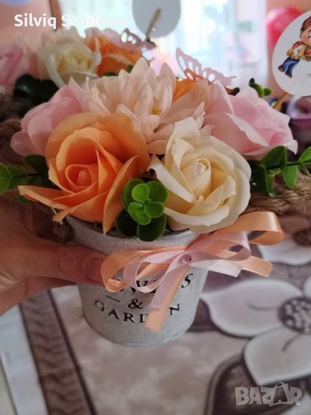 ☘️☘️Ново☘️☘️Метална кашпа със свежи и цветни сапунени цветя изработени от пластичен сапун💐🌷🌺 → Обява 45947073