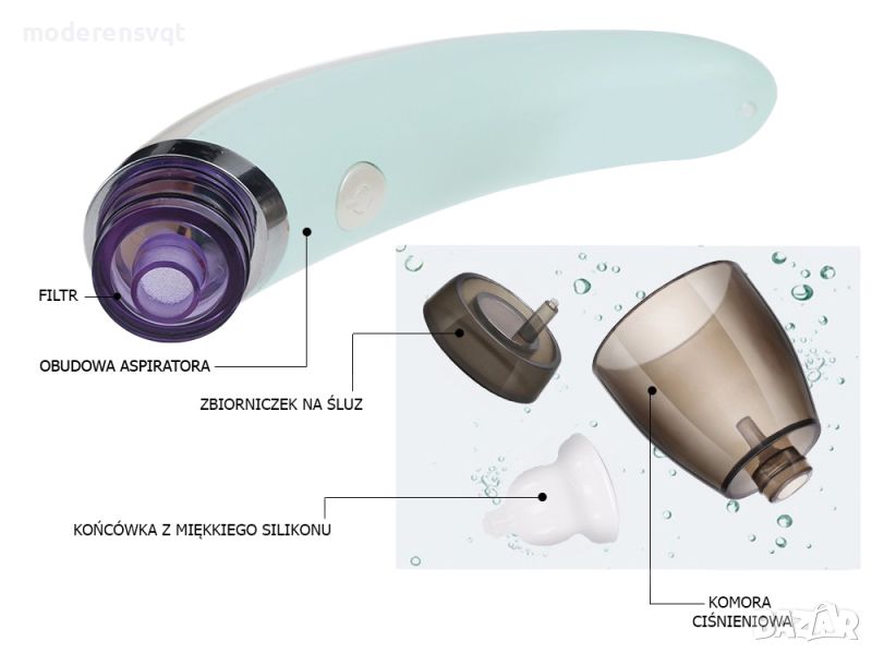 Предлага и еднократни капаци за по-добро почистване. През първата година бебетата дишат през носа си, защото не знаят как да си издухат носа, така че е абсолютно необходимо да се поддържа стриктна хигиена (за предпочитане с препарат за нос), за да се избегнат инфекции и други усложнения.