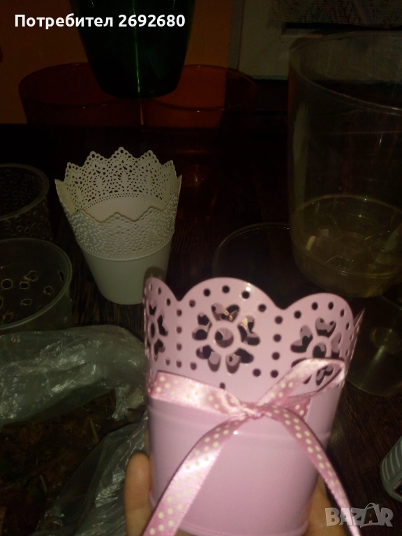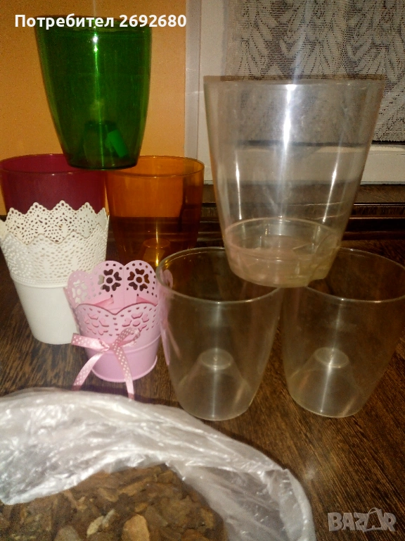 Също така има няколко прозрачни саксии саксии, които съм дупчила собственоръчно с поялник, жал ми е да ги изхвърля, те не влизат в цената, но могат да потрябват евентуално, защото някои от тях идеално пасват на кашпите от снимките.
