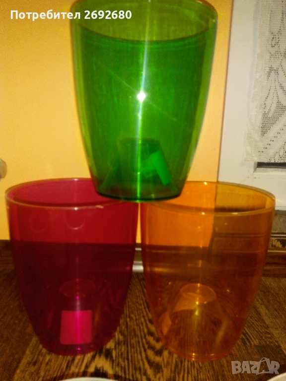 Три големи цветни прозрачни кашпи за орхидеи, чисто нови, изобщо не сме стигнали до тях, а вече нямаме орхидеи, затова останаха.