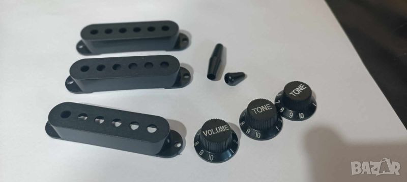 Към капачките има класическите 3 броя Knobs(1 Volume,2 Tone),черно типче за ръчката на тремолото(6 мм) и типче за 5 Way ключето
