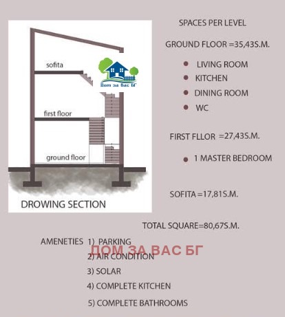80,68м2 ЗАСТРОЕНА ПЛОЩ. Общите части са примерни, тъй като посочената цена е за застроена площ!
