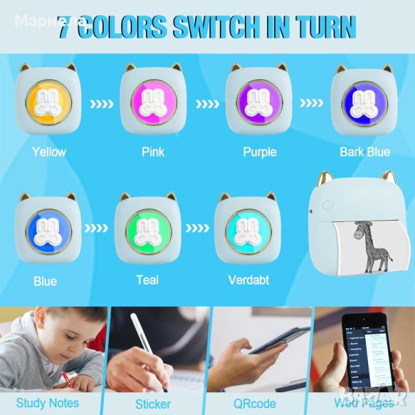 Подобрени 7-цветни LED светлини, седем цвята редуващи се, добавят нотка на креативност и привлекателност към вашето изживяване при печат. Ниска консумация на енергия, може да се използва 15 дни след пълно зареждане, което ви позволява да отпечатвате снимки и документи по всяко време и навсякъде .