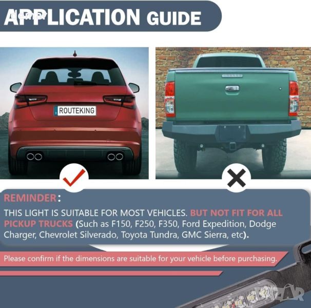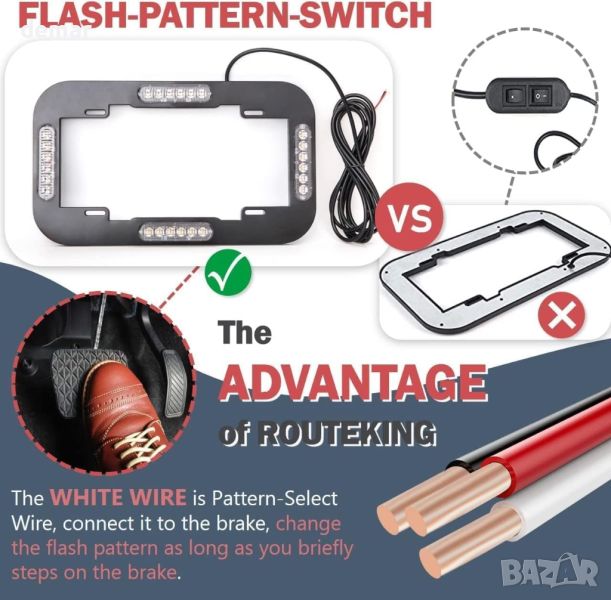 Светодиодното осветление на рамката на регистрационния номер Routeking се характеризира с лесна инсталация: червен проводник към ACC положителен, черен проводник към маса и бял проводник за избор на модел чрез свързване към спирачката. След като зададете желания модел, изключете белия проводник, за да запазите шаблона при включване на захранването. Оборудван с 24 светодиода с висока мощност, той осигурява видимост и безопасност при слаба светлина и неблагоприятни метеорологични условия. С размери 13,5 инча, той пасва на повечето превозни средства с изключение на пикапи и се използва широко за предупреждение за опасност от службите за спешна помощ. Неговият водоустойчив дизайн издържа на външни елементи като дъжд и мъгла.