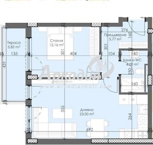 Апартамента се състои от дневна с трапезария и кухненски бокс, спалня, входно антре, баня с тоалетна и тераса.