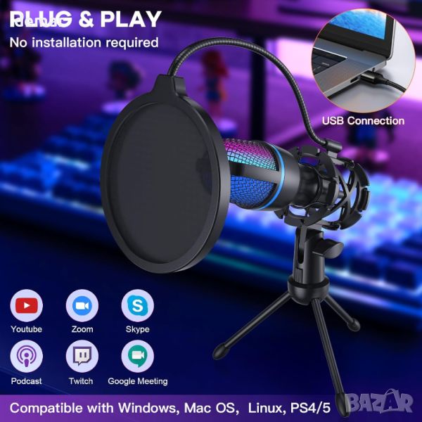 USB микрофон за компютър-кардиоиден кондензаторен микрофон със статив, поп филтър, RGB