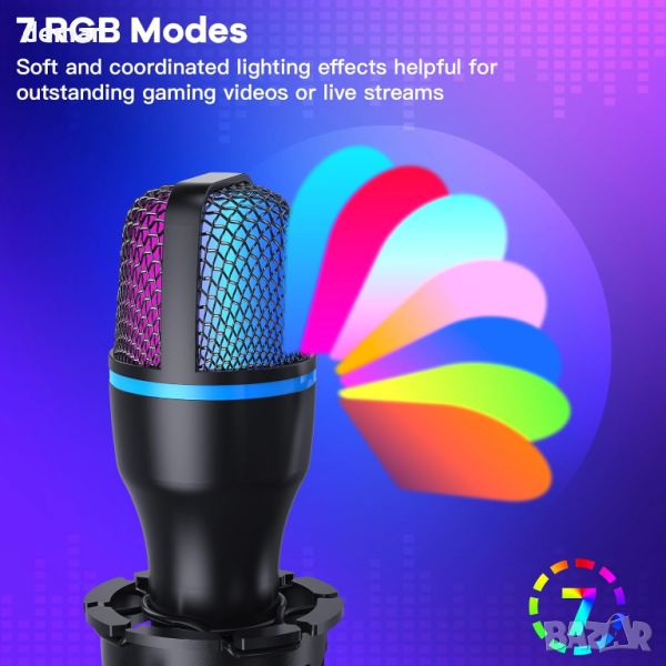 USB микрофонът за компютър предлага plug-and-play функционалност чрез USB 2.0 порт, съвместим с Windows, macOS и Linux. Идеален за игри, видеоконференции, стрийминг, подкастинг и много други, той разполага с кардиоиден модел на захващане за ясен, плавен звук и намален фонов шум. Технологията с нулева латентност подобрява преживяванията при поточно предаване на живо. Вграденото RGB осветление със 7 цвята добавя динамична естетика към вашата настройка. Лесен за инсталиране със стабилна стойка - триножник, той е перфектен за употреба от начално ниво, като гарантира качествено изпълнение. Пакетът включва микрофон, поп филтър, стойка - статив, USB кабел (1,5 м), преносима чанта и ръководство за потребителя.