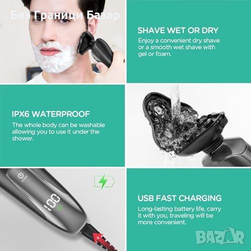 Мокро и сухо бръснене: Използване на сухо за удобство или мокро с пяна за комфорт, дори под душа. Водоустойчива (IPX6) и лесна за почистване.