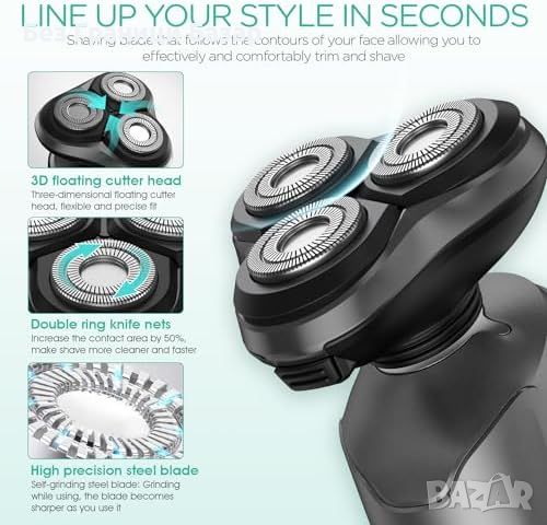 4-в-1 ротационна самобръсначка: Четири сменяеми глави за бръснене на брада, подрязване на бакенбарди и носни косми, и почистване на лице.