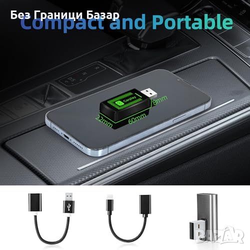 Универсална съвместимост - Работи с повечето автомобили, поддържащи жичен CarPlay. Не е съвместим с Volvo и Polestar с портретен дисплей.