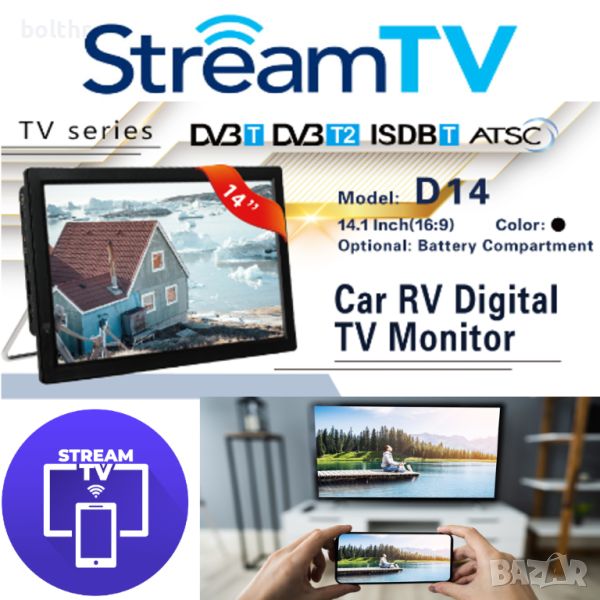 Портативен, лесно преносим 14 инча Телевизор с цифров тунер и вградена акумулаторна батерия за автономна работа и вградена streaming функция за безжично прожектиране на смартфон директно към телевизора.