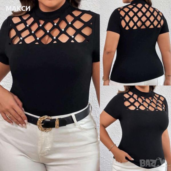Макси модерна елегантна блуза с ефектни прорези и бели перли в наситено червено, синьо и черно → Обява 45973035