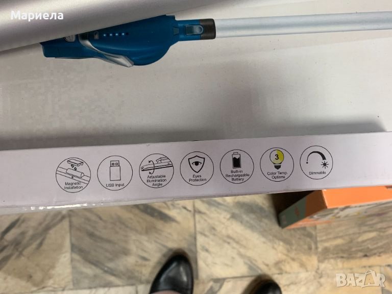 Лампата е закупена от разпродажба в Германия .Просто докоснете сензорния бутон, за да регулирате 3 нива на цветовата температура на топла светлина (6000K), естествена светлина (4500K), бяла светлина (3000K). Продължително натискане за по-ярко и по-слабо, безстепенно затъмняване .Безопасно за деца.Осветлението за гардероба използва щадящ очите LED панел, осигурява нежно осветление без трептене, което няма да измори очите ви, дори ако останете на светлина за дълго време.Свободата да имате перфектния прожектор, когато използвате включените магнитни стойки, това ви позволява да завъртите монтираната на стената светлина за четене на 135 градуса .Идеална лампа за четене или за всякакви други дейности . Перфектни огледални светлини за грим.С вградена силна магнитна подложка, той може да бъде поставен върху всякаква метална повърхност или можете също да инсталирате лампата с помощта на включената основа за монтиране на магнит с 3M самозалепваща лента, за да залепите навсякъде ти искаш. Не са необходими инструменти. Лесно отстранете настолната лампа от магнитните стойки за зареждане.Вградена акумулаторна батерия от 2500 mAh, която лесно се зарежда с помощта на USB кабел (включен). Батерията отнема само 3 часа за пълно зареждане .Идеална за дрешник, огледало, спалня и коридор.Изпращам с Еконт или Спиди с опция тест и преглед до удобен за Вас офис или домашен адрес .