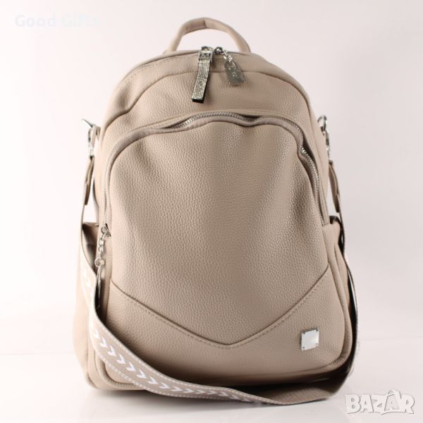 Дамска кожена раница с голям преден джоб, Светло кафява