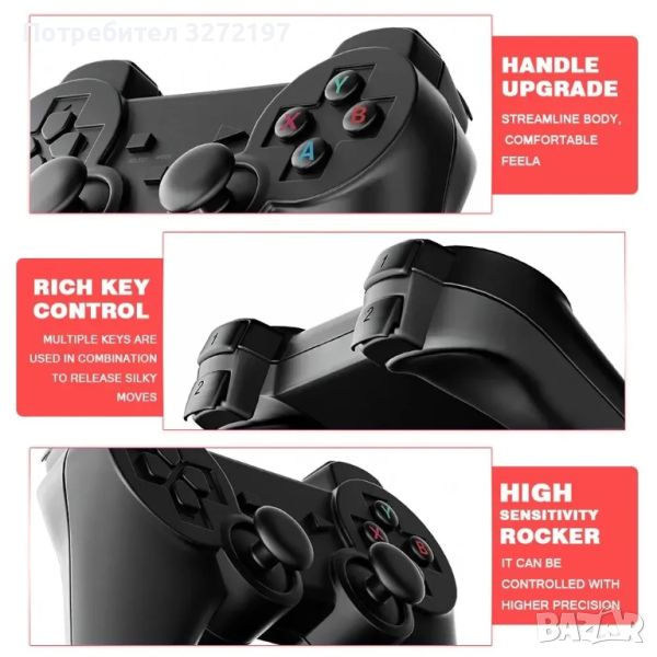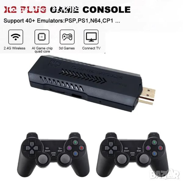 Оборудван с два 2.4G безжични геймпада. Може да поддържа до 2 играчи едновременно и можете да управлявате дистанционно и да се наслаждавате на играта на дивана със семейството или приятелите си. 12 емулатора, съвместими с игри във формат PS1,CPS,NEOGEO,GB,GBC,SFC,FC,MD,GG,SMS,GBA.