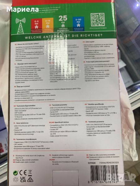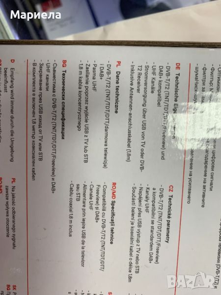 Вътрешна антена с усилвател:Вътрешна антена за приемане на цифрова ефирна телевизия (DVB-T/DVB-T2) и радио сигнали (DAB+).