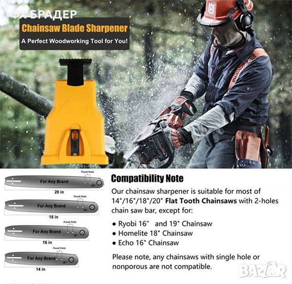 Точилото е съвместимо с повечето верижни триони с двоен отвор (т.е. 14 "/ 16" / 18 "/ 20").