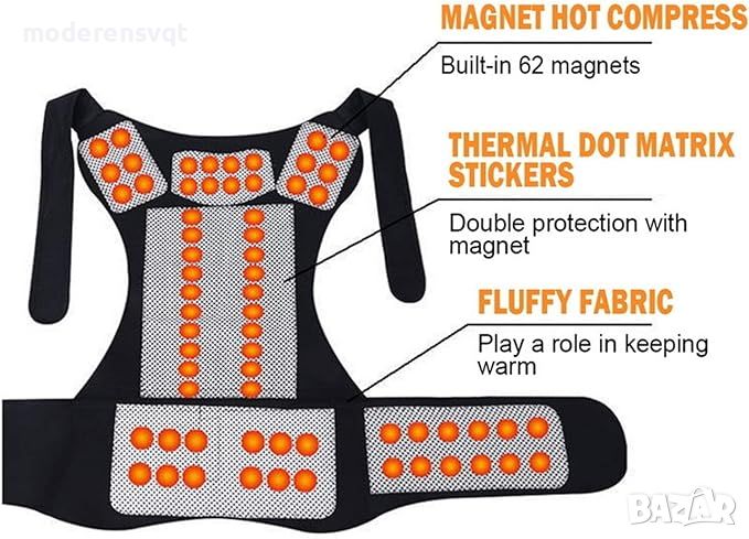Благодарение на свойствата на този колан, ще облекчите болките от всякакъв характер в гърба, врата и гръбначния стълб. Той разполага с 16 малки неодимови магнита с диаметър 15/3мм, които осигуряват допълнителна лечебна терапия и рефлектират върху болката. Осигурява твърда, но деликатна поддръжка на горната задна част. Изработен от висококачествена, дишаща материя, коланът е изключително удобен и може да се слага под и над дрехите, като няма да усещате, че е там.