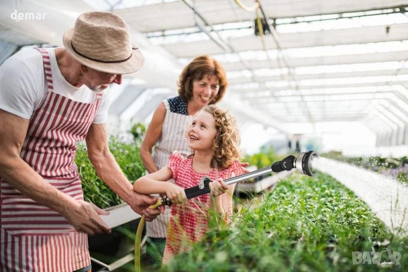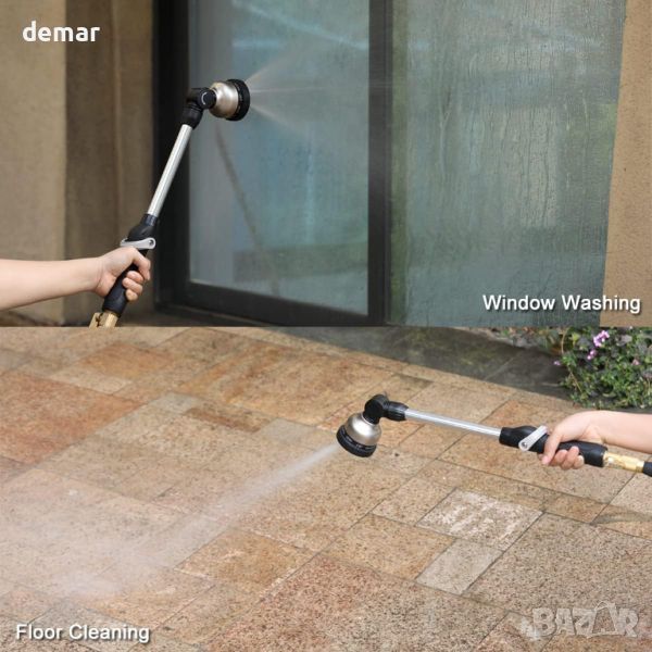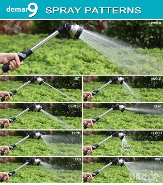 Регулируемата пръскачка за градински маркуч, изработена от цинкова сплав, алуминиева сплав и TPR, е издръжлива, лека и лесна за хващане. Разполага с устойчива на хлъзгане дръжка и некорозивна външна част за удължен живот на дюзата. Удароустойчивият гумиран безел циферблат издържа на удари и тежка сила. Предлага 9 режима на поливане с регулируема на 180° въртяща се глава, подходяща за различни задачи като почистване на вътрешни дворове, поливане на градини и миене на коли или домашни любимци. Издръжливият дизайн се справя с високо налягане (GHT 180 - 270 psi) от вход от 50 - 100 psi. Лесният за използване контролер с палец опростява работата, което го прави идеален за всички възрасти. Неговата 16-инчова дължина осигурява разширен обсег, а непропускливият дизайн осигурява постоянен воден поток с издръжливо и плътно уплътнение.