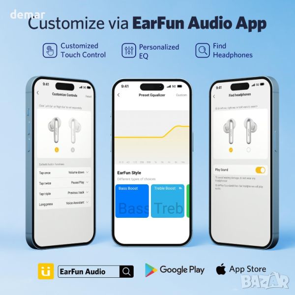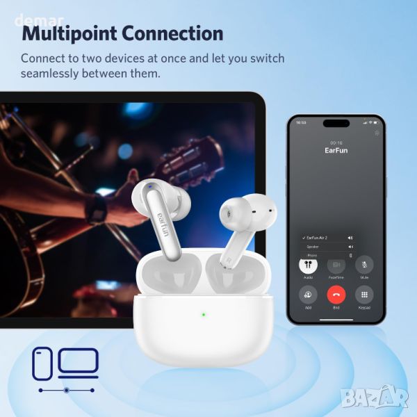 Безжичните слушалки EarFun Air 2 разполагат с 10 мм вълнени композитни динамични драйвери за ясен, детайлен звук и поддържат LDAC кодек и Hi-Res Audio сертификат за превъзходно качество на звука на устройства с Android. С 4 микрофона и ENC те осигуряват ясни разговори, като изолират гласа ви от околния шум. Те предлагат 40 часа общо време за възпроизвеждане с USB-C кутия, 9 часа с едно зареждане и 23 часа в LDAC режим. Bluetooth 5.3 и многоточковата връзка позволяват безпроблемно превключване между устройствата. Леки с тегло от 0,16 унции (4,5 г) и с ергономичен дизайн, те се доставят с 4 накрайника за уши за перфектно прилягане. Приложението EarFun позволява аудио персонализиране, настройки на сензорното управление, проверки на батерията и функция „Намиране на слушалки“.