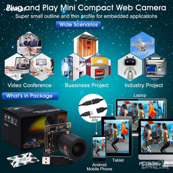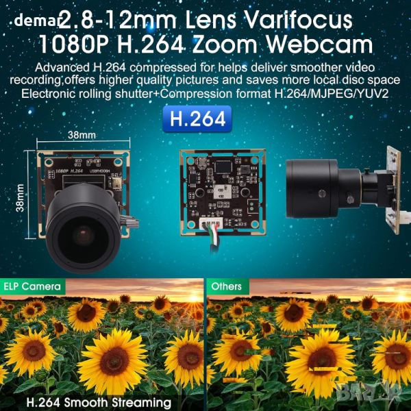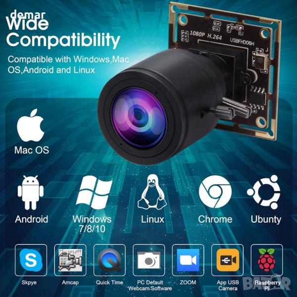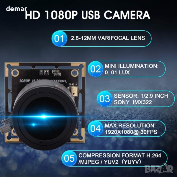 Модулът за USB камера ELP-FHD06H-FV 1080P разполага с 2MP IMX323 сензор, осигуряващ ясни изображения и кристално чисто видео при 30 кадъра в секунда, дори при условия на слаба светлина (0,01 Lux). Той включва 2,8-12 mm варифокален обектив с ръчен фокус за регулируема яснота и различни ъгли на гледане. Тази plug-and-play уеб камера поддържа видео компресия H.264/MJPEG/YUV2 и е съвместима с Windows, Linux, Mac OS, Android и Raspberry Pi. Той е идеален за различни приложения, включително машинно оборудване, вендинг машини, преносими компютри и видео домофони, и се предлага с 1-метров USB кабел за лесно свързване.