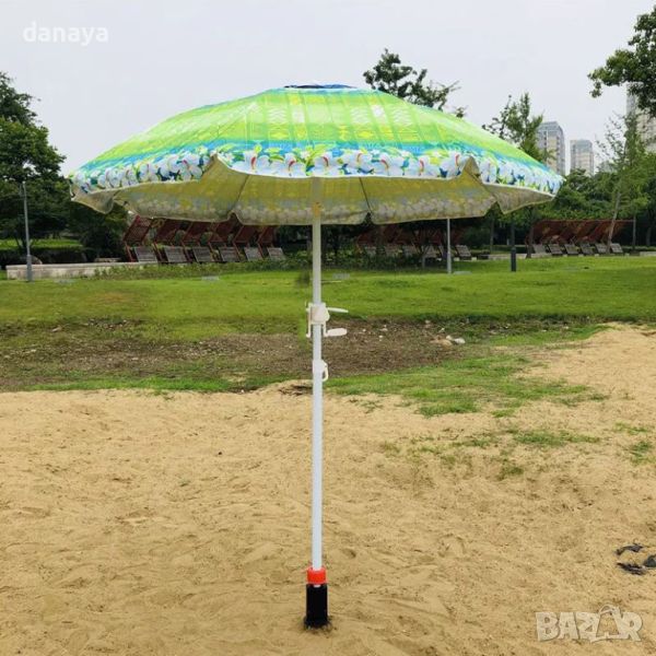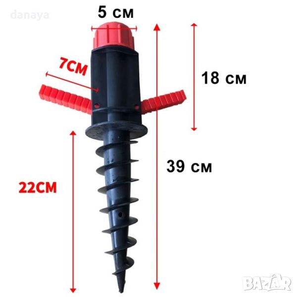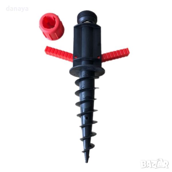 плажен чадър с удобни дръжки за завъртане. Поставка за чадър с пластмасов болт за затягане. Елементарен, но гениален инструмент, с който лесно и стабилно ще закрепите плажния чадър в пясъка. Чадъра се вкарва в свредлото като се закрепя със затягащ винт. Подходящ за повечето модели чадъри.