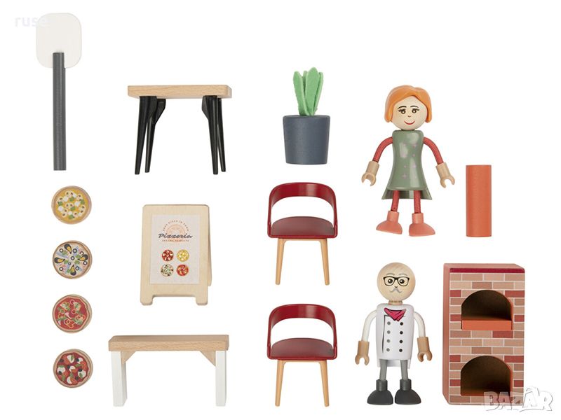 димоотвод, 1 х шпатула за изваждане на пица и 4 х парчета пица, 1 х щанд, 2 х кукли, 1 х растение, 1 х табелка