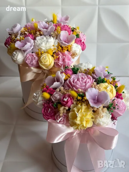 Букет от ръчно изработени ароматни соеви свещи под формата на различни видове цветя, ухаещи невероятно.