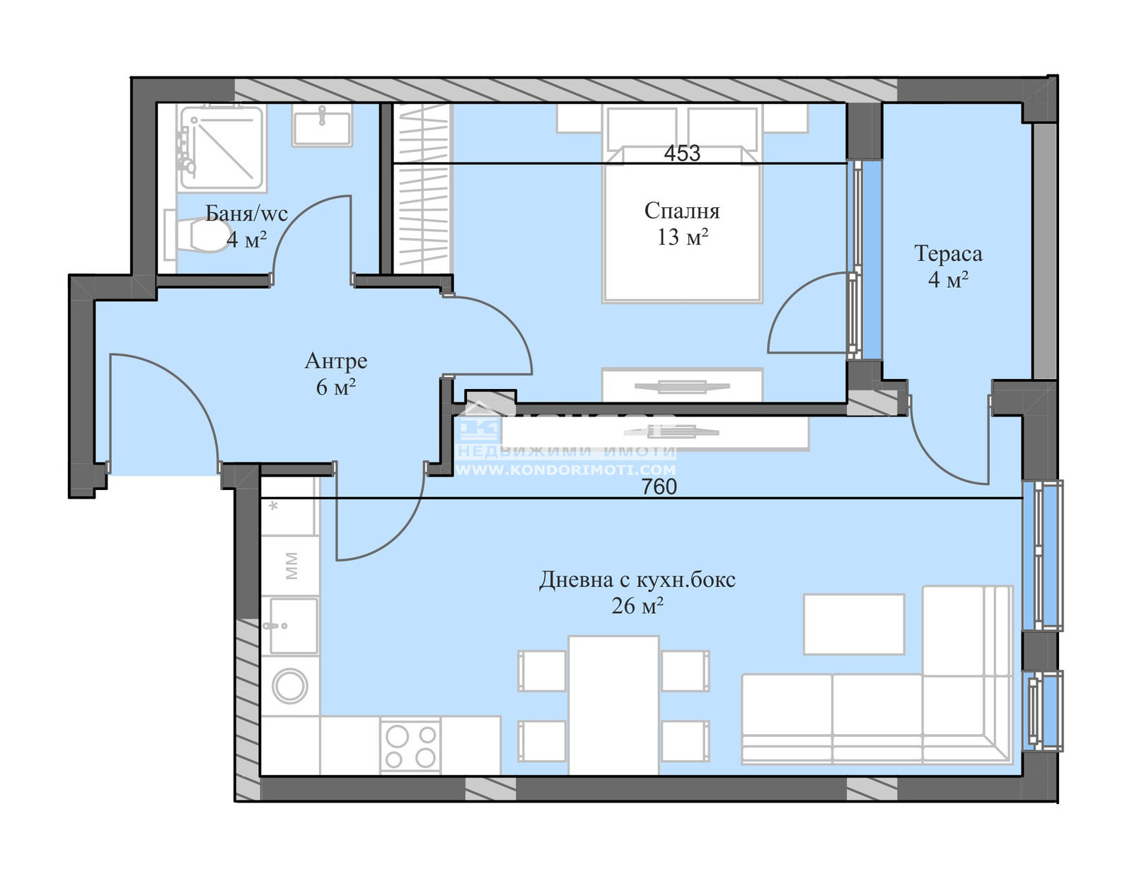 Разпределения - Просторни и много функционални апартаменти с просторни стаи и гледка към Стара планина, а също и с партерни жилища с двор и такива с големи панорамни тераси. Апартаментът, който Ви предлагаме е с изцяло източно изложение и се състои от дневна 26кв.м. с кухненски бокс и трапезария и излаз на обща тераса, една самостоятелна спалня 13кв.м., баня с тоалетна и широко входно антре.