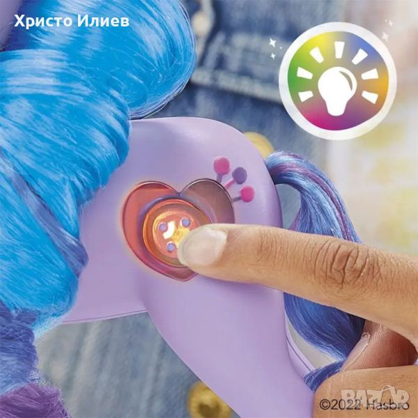 See Your Sparkle Izzy Moonbow включва 20 сантиметрова лилава фигура на пони с вдъхновено от героя копче във формата на сърце Cutie Mark от едната страна. Дългата мека синя коса на фигурката е накъдрена в характерния й стил.