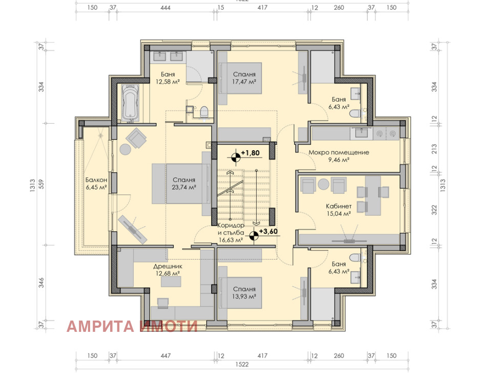 2-ро ниво с площ 168,95 м2: голяма спалня (master bedroom) със собствена просторна баня и тоалетна, гардеробно помещение и чудесна тераса, две спални със собствени баня и тоалетна, кабинет и мокро помещение.