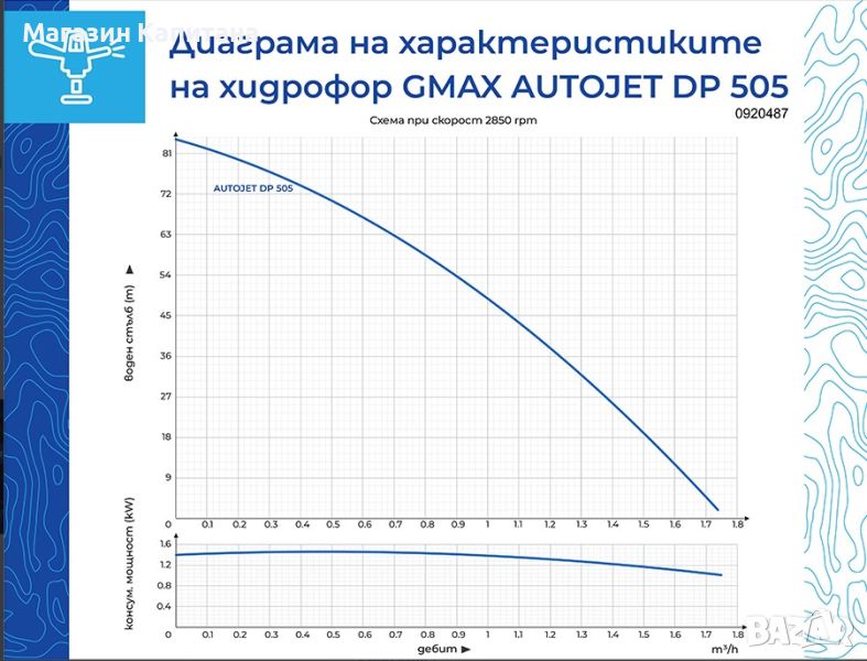 Ежекторен хидрофор Gmax AUTOJET DP505 е изключително ефективна система за автоматично водоснабдяване за различни битови и промишлени цели. Машината е с мощност 1100 W, максимален дебит 1,8 m³/h, максимално налягане 6,5 бара, максимален воден стълб 65 м. и дълбочина на засмукване 35 м. Съставена е от стационарна помпа и разширителен съд с пресостат, който следи налягането, за да бъдат подсигурени нужните за целта количество вода и напор. Оборудвана е с термозащита.