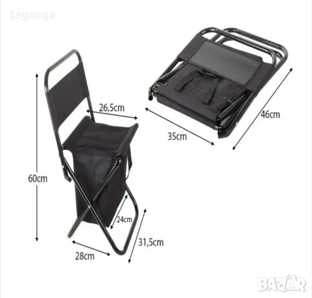 Сгъваем стол с облегалка, термочанта, дръжки за носене, за градина, къмпинг, плаж, метална конструкция, преносим, удобен и стабилен, 31,5 х 26,5 х 60 см, черен.