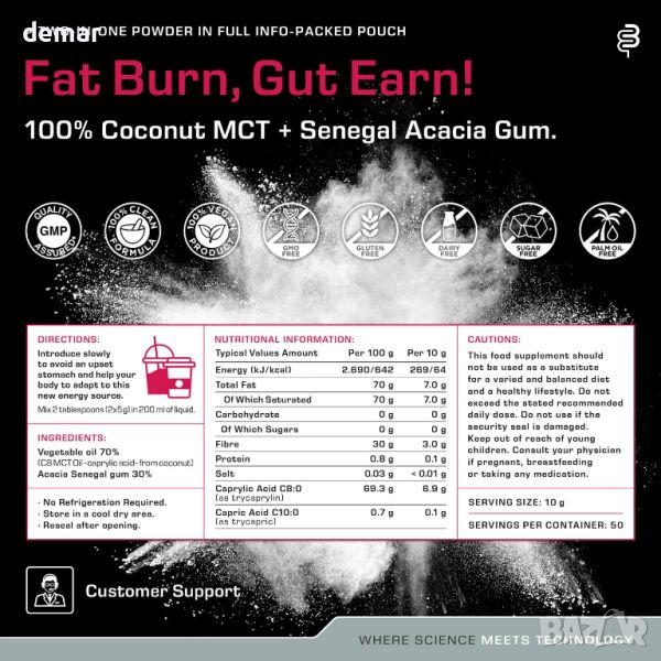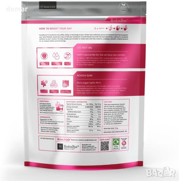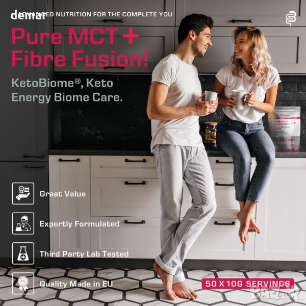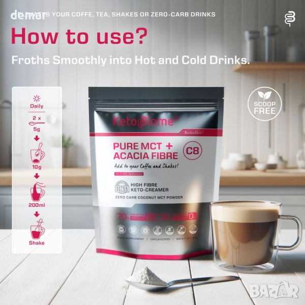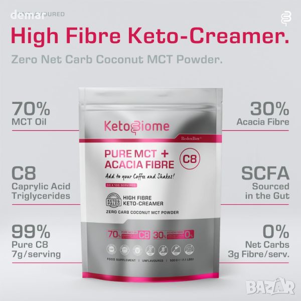 KetoBiome® High-Fibre Keto-Creamer съчетава 70% чисто C8 MCT масло и 30% акациеви фибри в опаковка от 500 g, идеална за кето диета. Този пребиотик без съдържание на въглехидрати и захар е идеален за подобряване на вашето кафе и шейкове. Чистото C8 MCT масло осигурява бърза, чиста енергия, докато акациевите фибри поддържат здравето на храносмилането. Насладете се на богата, кремообразна текстура и ползи за здравето, без да правите компромис с вашия кето начин на живот.