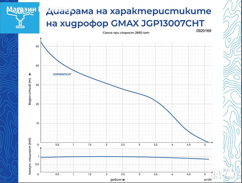 Хидрофорна помпа Gmax AUTOJET-1300 W е изключително ефективна система за автоматично водоснабдяване за различни битови и промишлени цели. Машината е с мощност 1300 W, максимален дебит 80 л/мин, максимално налягане 4,7 бара, максимален воден стълб 50 м. и дълбочина на засмукване 8 м. Съставена е от стационарна помпа и разширителен съд с пресостат, който следи налягането, за да бъдат подсигурени нужните за целта количество вода и напор.
