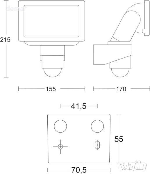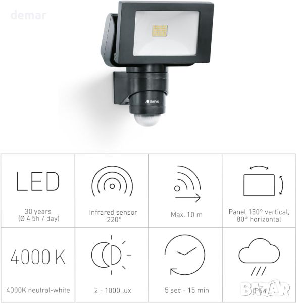 Този здрав прожектор предлага 1375 lm яркост с неутрална бяла (4000K) светлина при икономични 14,7 W, идеален за осветяване на големи площи като алеи и дворове. Той разполага с надежден PIR детектор за движение с 220° ъгъл на засичане и 10 m обхват, регулируем с предоставените сензорни капаци. Изработен от висококачествена UV-устойчива пластмаса и алуминий, осигурява висока издръжливост. Главата на прожектора се завърта хоризонтално на 80° и вертикално на 150°, с PIR сензор, способен да наблюдава две страни на къща, когато е монтиран в ъгъла. Включени са монтажни материали и размери 166 x 155 x 210 mm, тегло 0,883 kg, с мрежово свързване 220-240 V / 50-60 Hz.