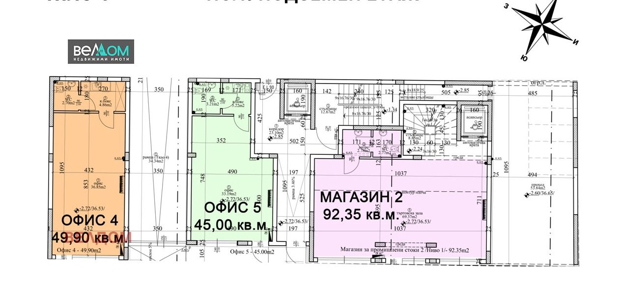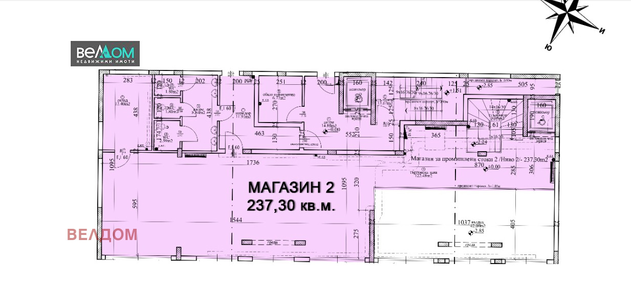 Магазинът е на 2 нива с обща площ 434 м2 и чиста застр. площ 330 м2. Първо ниво партер- 92,35 м2 чиста застр. площ, включваща търговска зала, WC, стълбище, асансьор към второ ниво. Второ ниво (над първо)- 237,30 м2 чиста застр. площ, включваща голяма търговска зала и склад/канцелария. Статутът на помещението е магазин за промишлени стоки , но би могло да се ползва и за офис, представитество и пр.