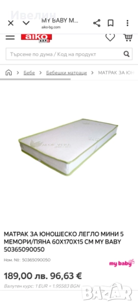 МАТРАК за детско юношеско легло МЕМОРИ/ПЯНА 60X170X15 CM. АЛОЕ ВЕРА - ПРОДАДЕН
