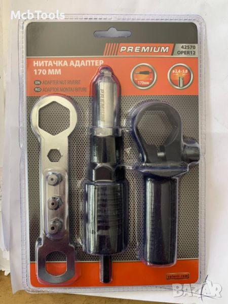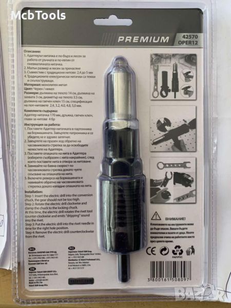 Нитачка адаптер PREMIUM под формата на представка за електрическа, пневматична и акумулаторна бормашина. Адаптерът нитачка е по-бърз и лесен за работа от ръчната и по-евтина пневматична нитачка. Малък размер 170 мм, лесен за пренасяне, перфектно се побира в куфара с инструменти. Съвместима с традиционни нитове: Al/ST 2.4-5 мм. Предлаганият модел е изцяло метален. Изработена от монолитен метал, черен/никел на цвят. Нитачката е с дължина на тялото 14 см, дължина на захвата 3 см, диаметър на тялото 3.5 см и дължина на гаечен ключ 15 см.